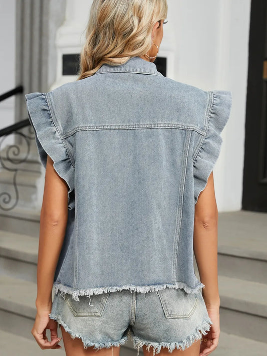 Drawstring Pocketed Button Up Sleeveless Denim Jacket