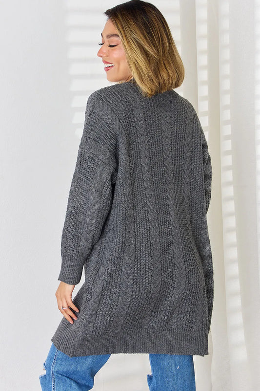 Cable-Knit Open Front Dropped Shoulder Cardigan