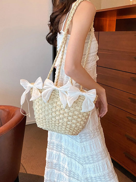 Woven Straw Shoulder Bag with Bow Detail