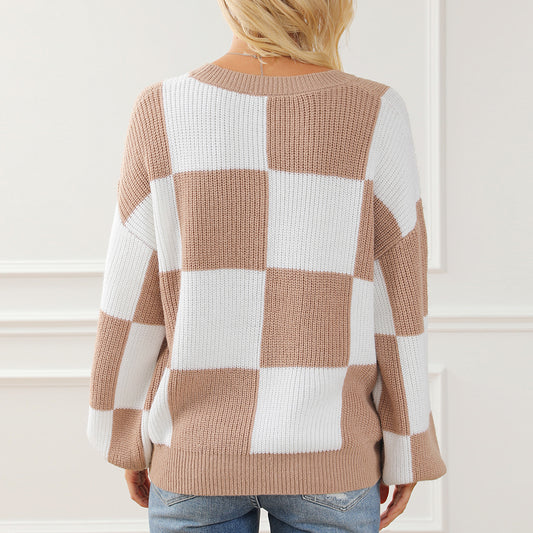 Checkered Round Neck Drop Shoulder Long Sleeve Sweater