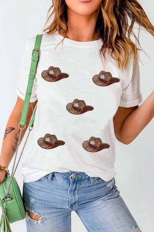 Sequin Hat Round Neck Short Sleeve T-Shirt