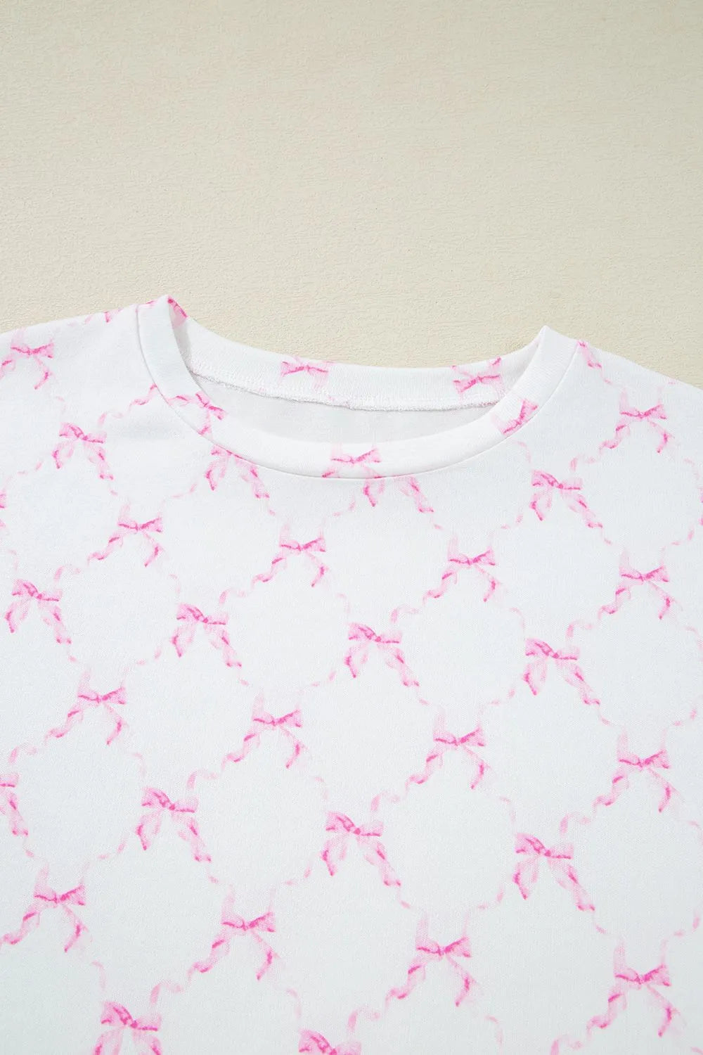 Bow Print Lettuce Trim Round Neck Top and Shorts Lounge...