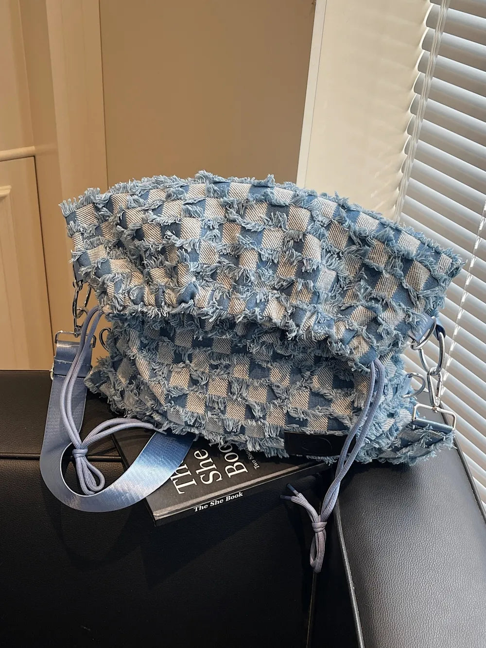 Checkered Raw Edge Adjustable Strap Convertible Bag
