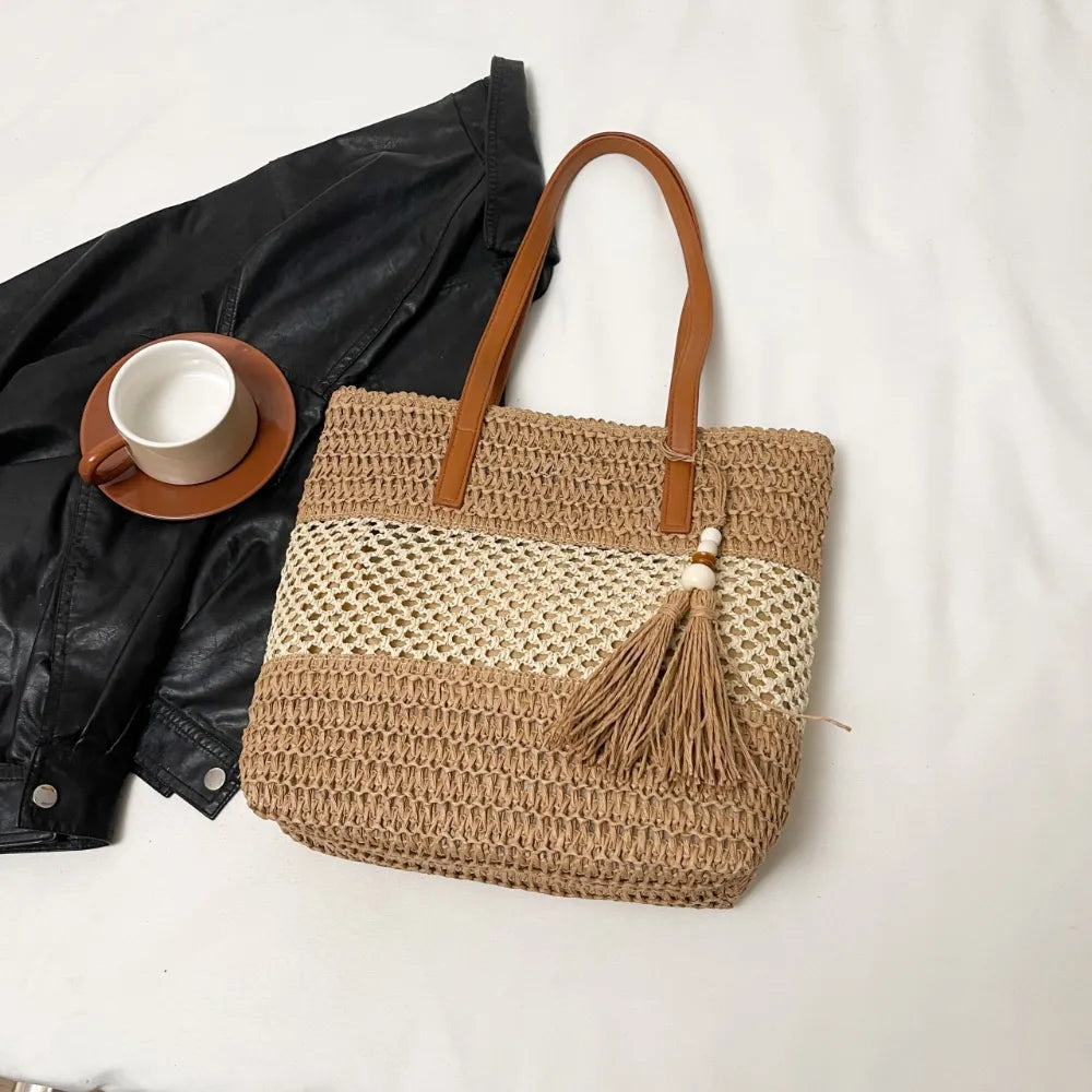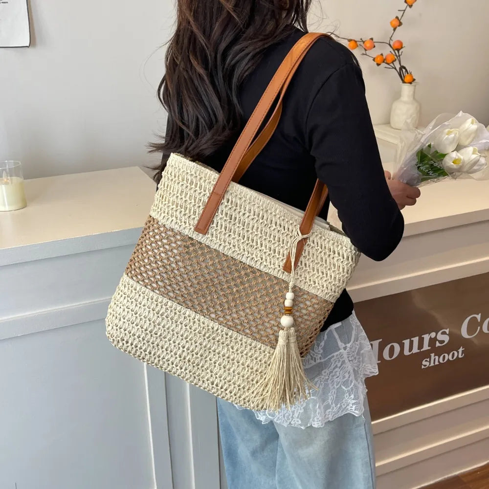 Contrast Woven Straw Beach Tote Bag with Tassel Detail
