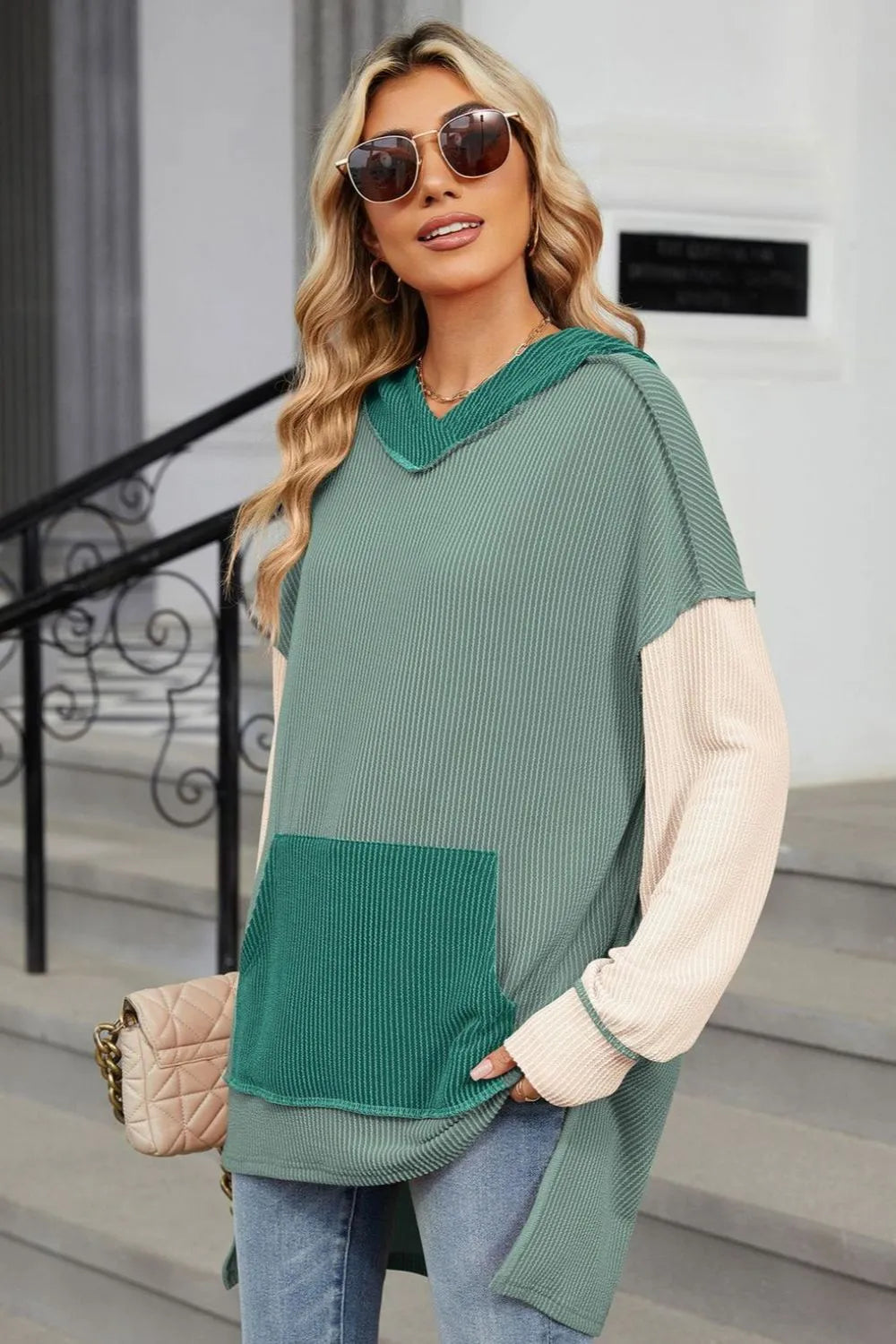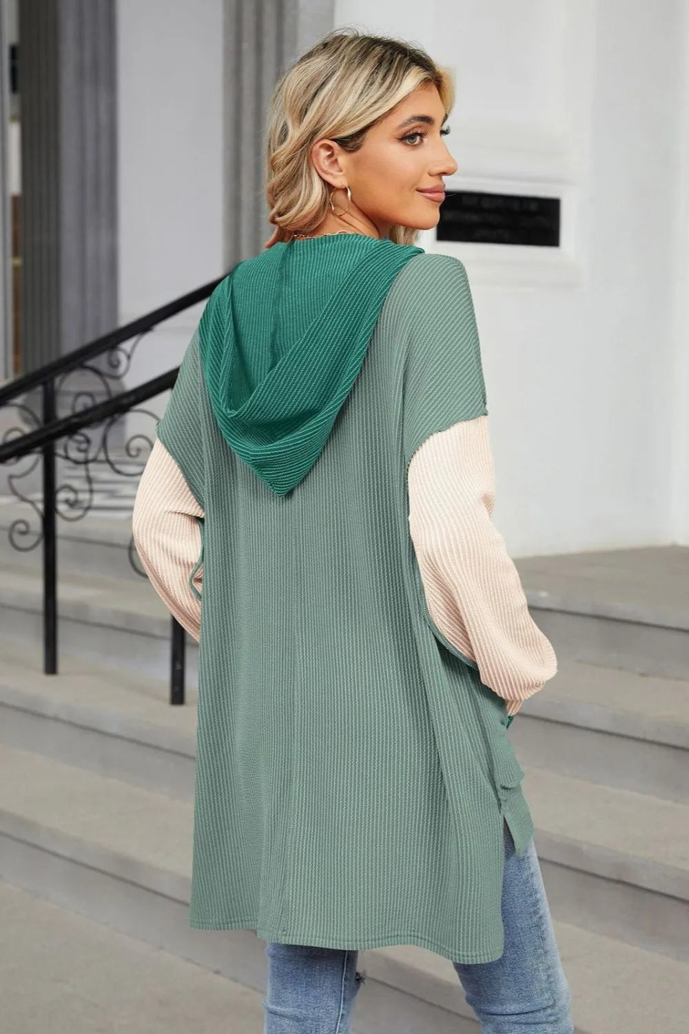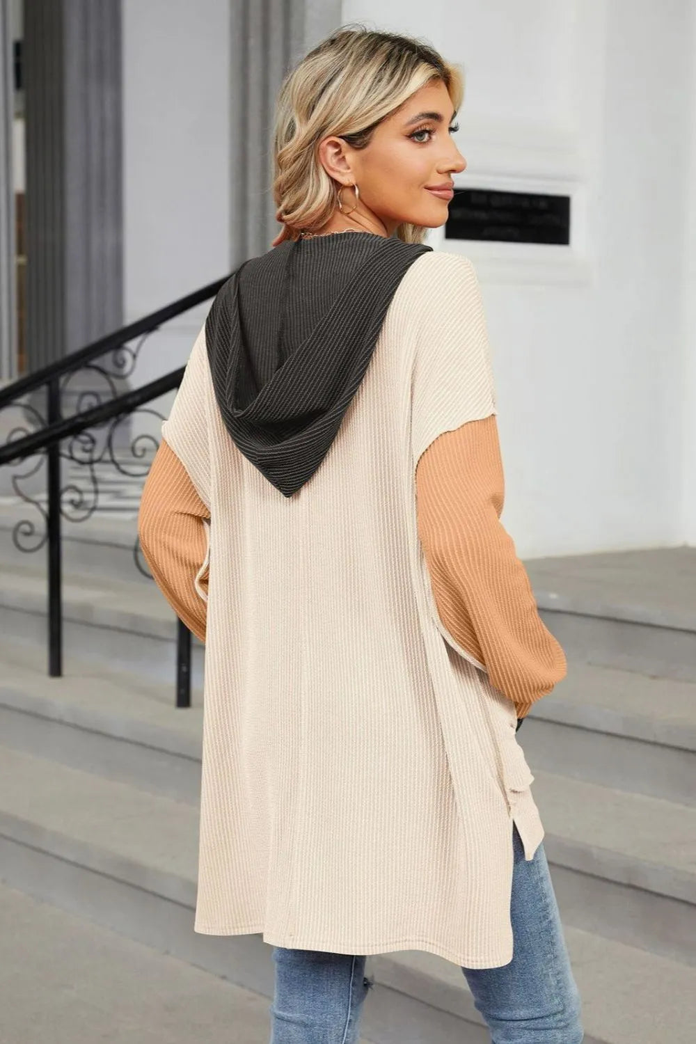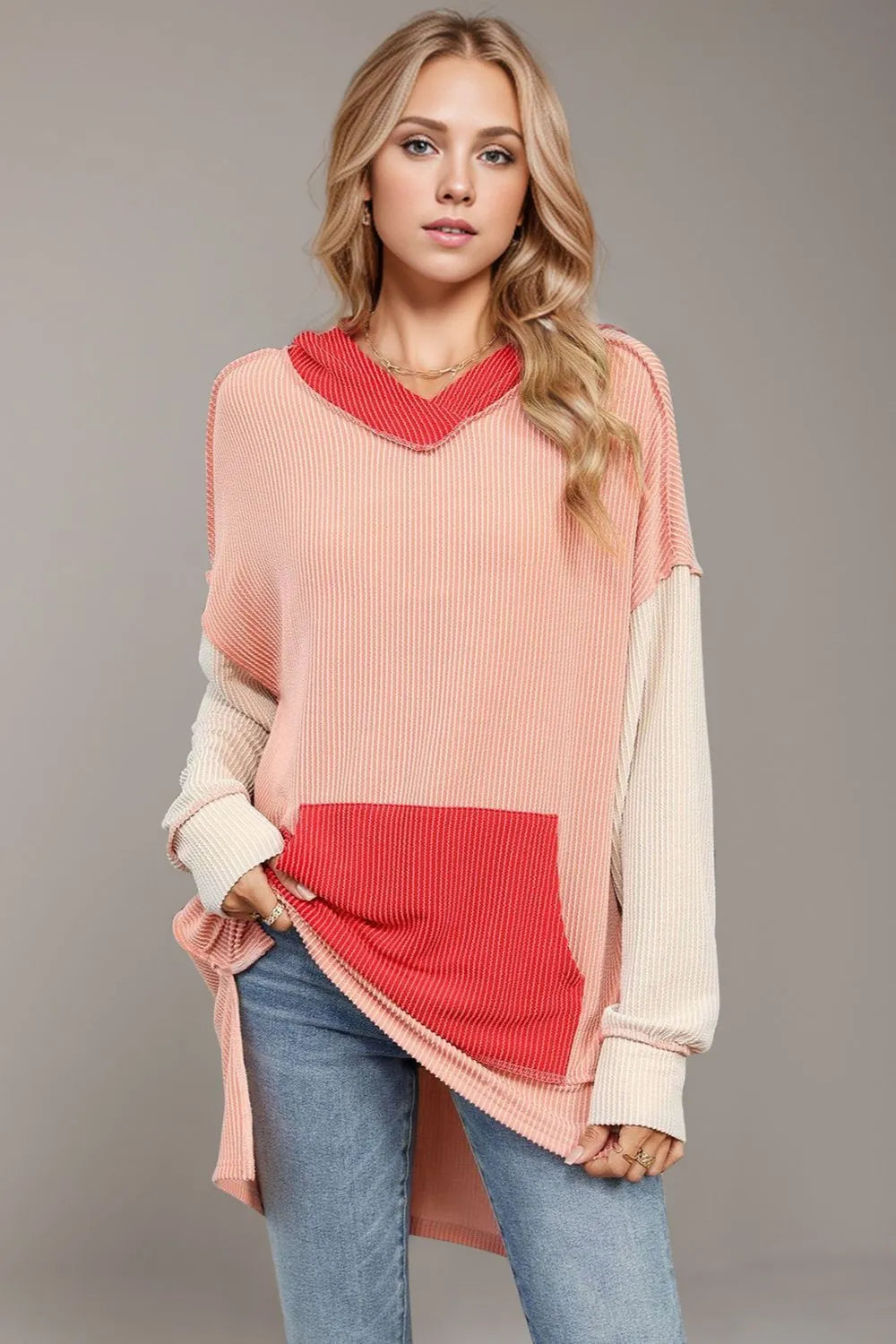 Double Take Contrast Hooded Long Sleeve Top