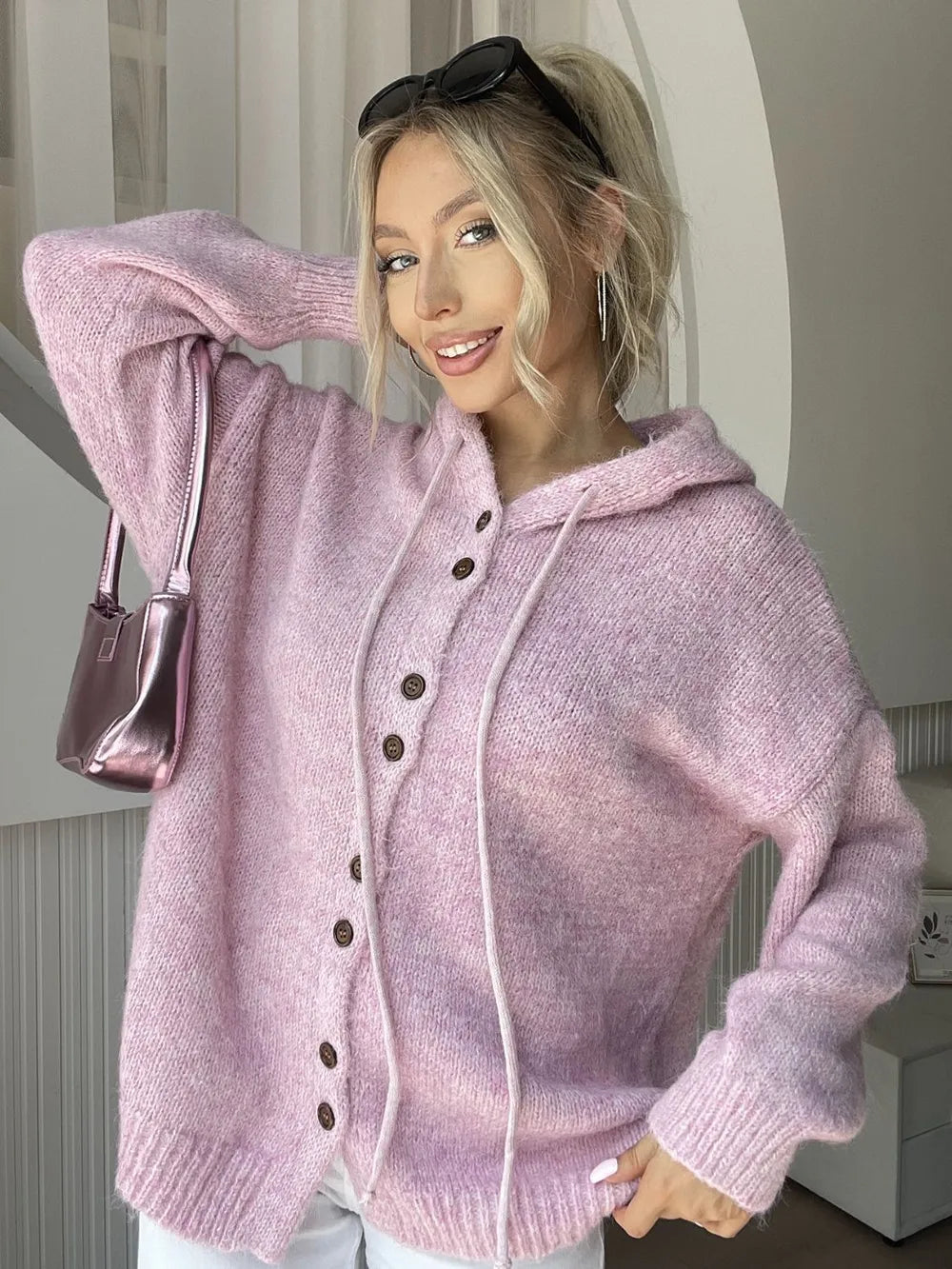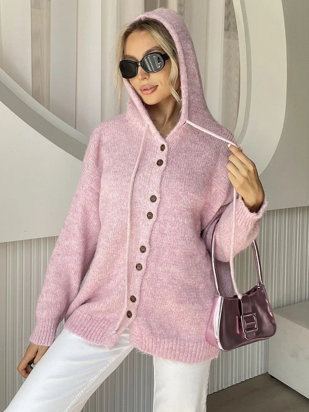 Drawstring Button Down Hooded Cardigan