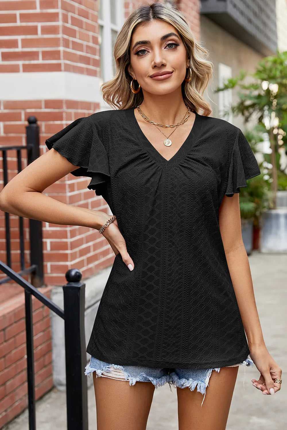Eyelet V-Neck Flutter Sleeve T-Shirt