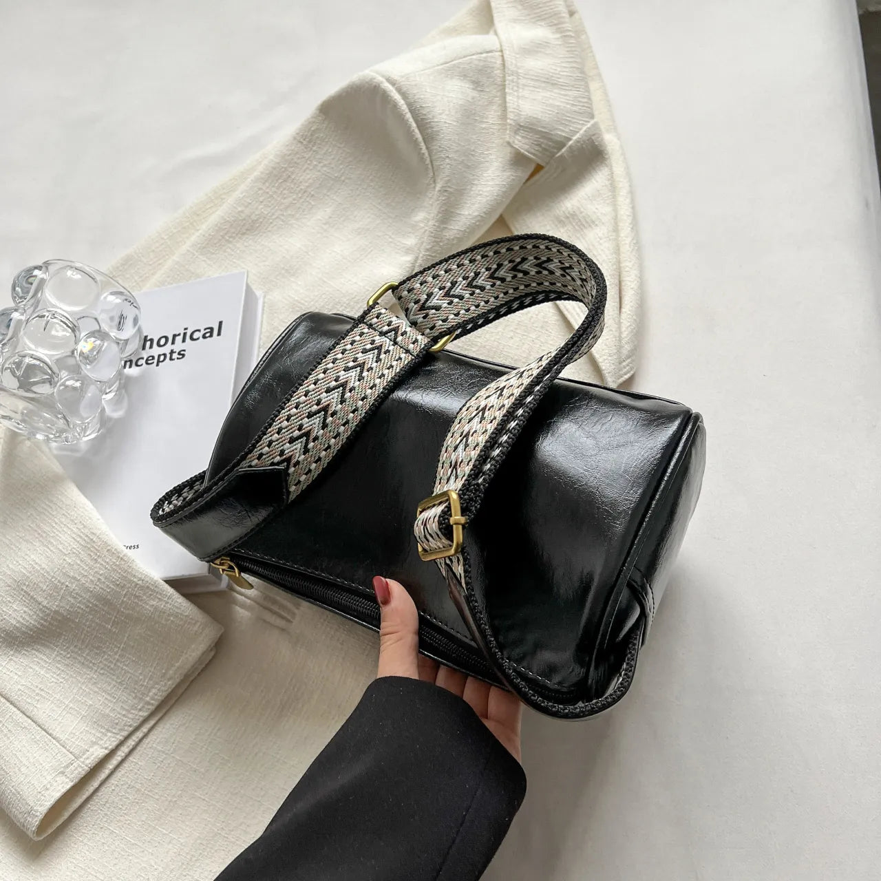 Leather Shoulder Bag with Woven Strap