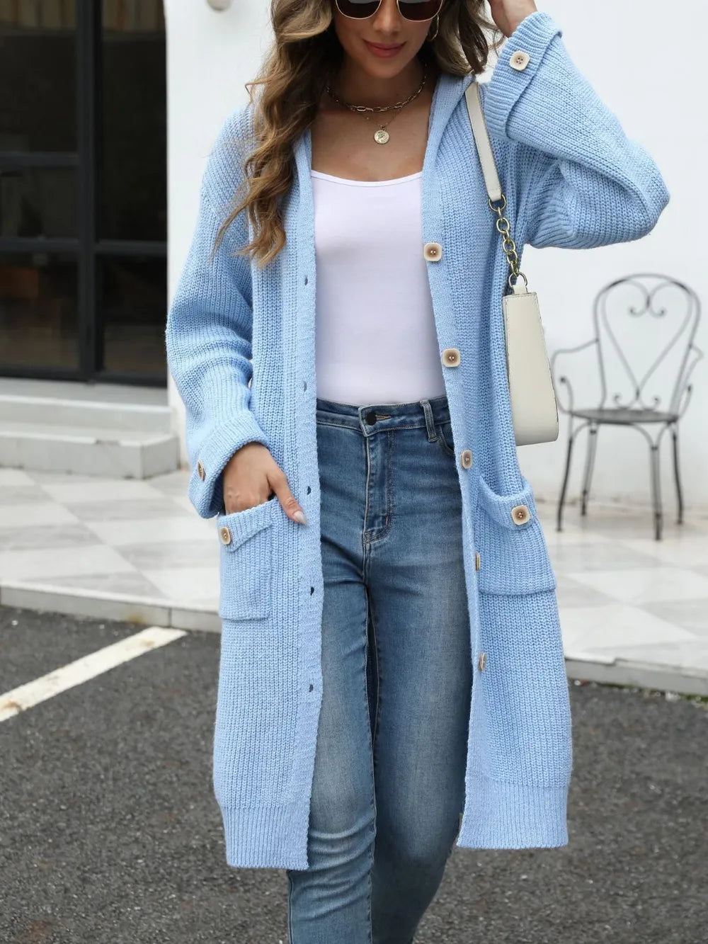 Pocketed Button Up Long Sleeve Hooded Cardigan