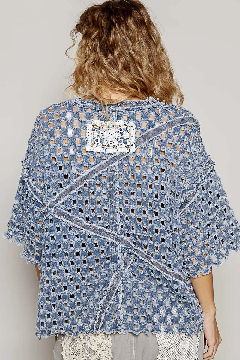 POL V-Neck Short Sleeve Top with Laser Cut Detail
