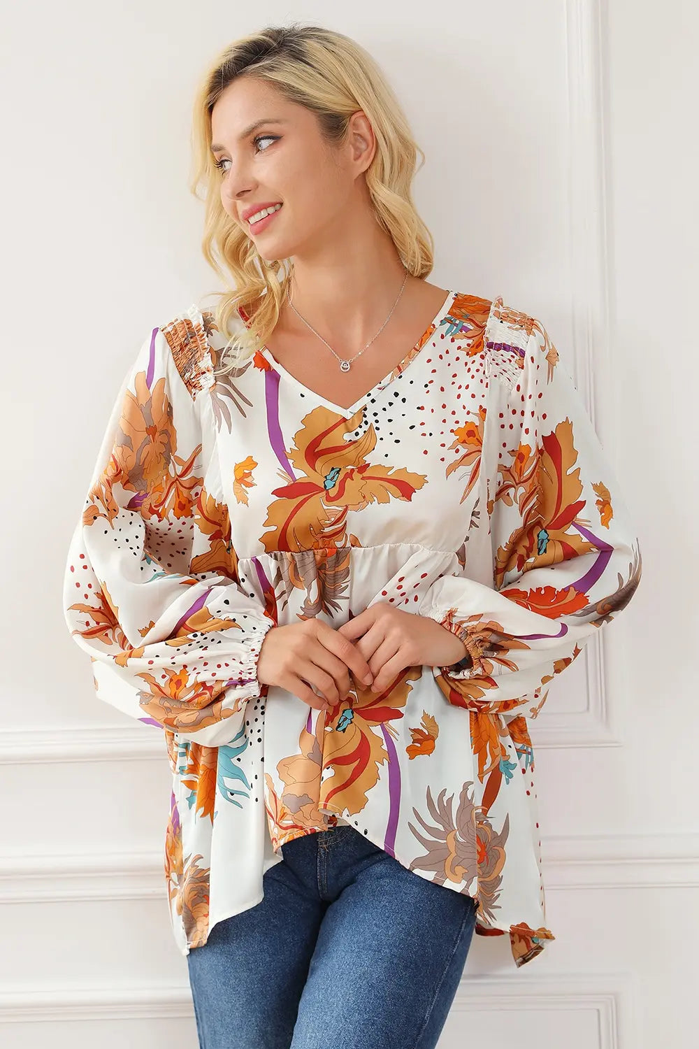 Printed V-Neck Smocked Balloon Sleeve Blouse