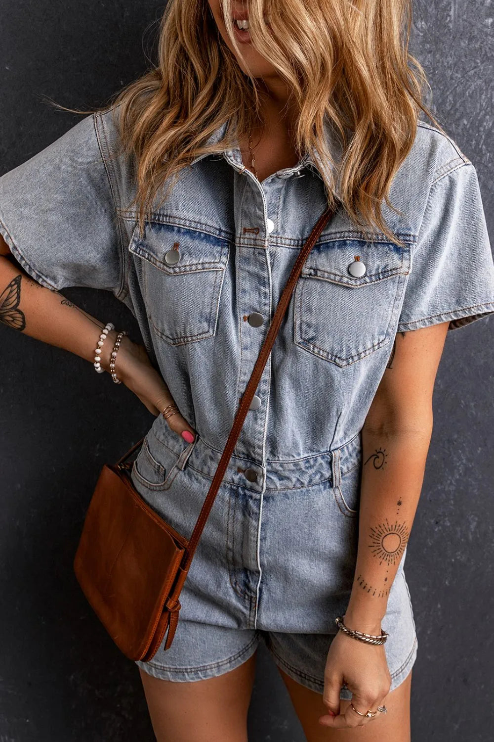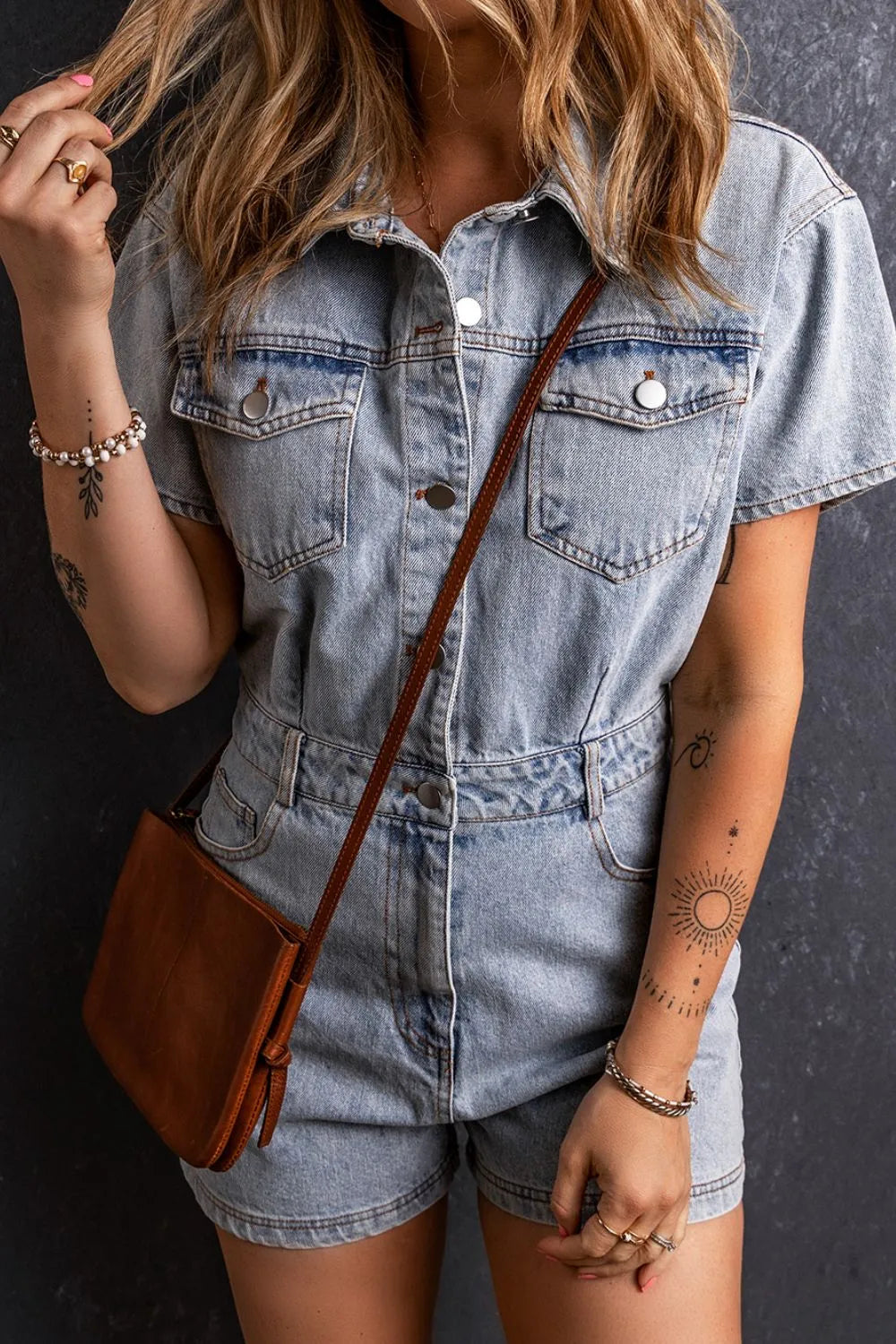 Washed Button Down Pocketed Denim Romper