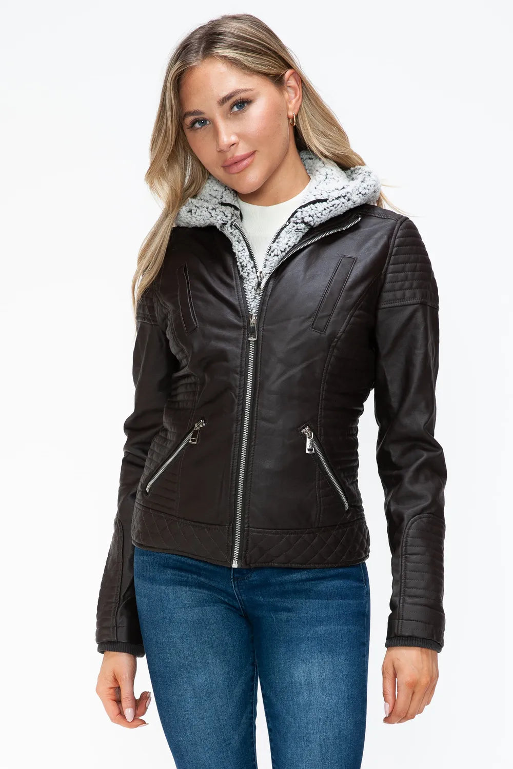 YMI Faux Layered Double-Zipper Jacket with Fuzzy Hood