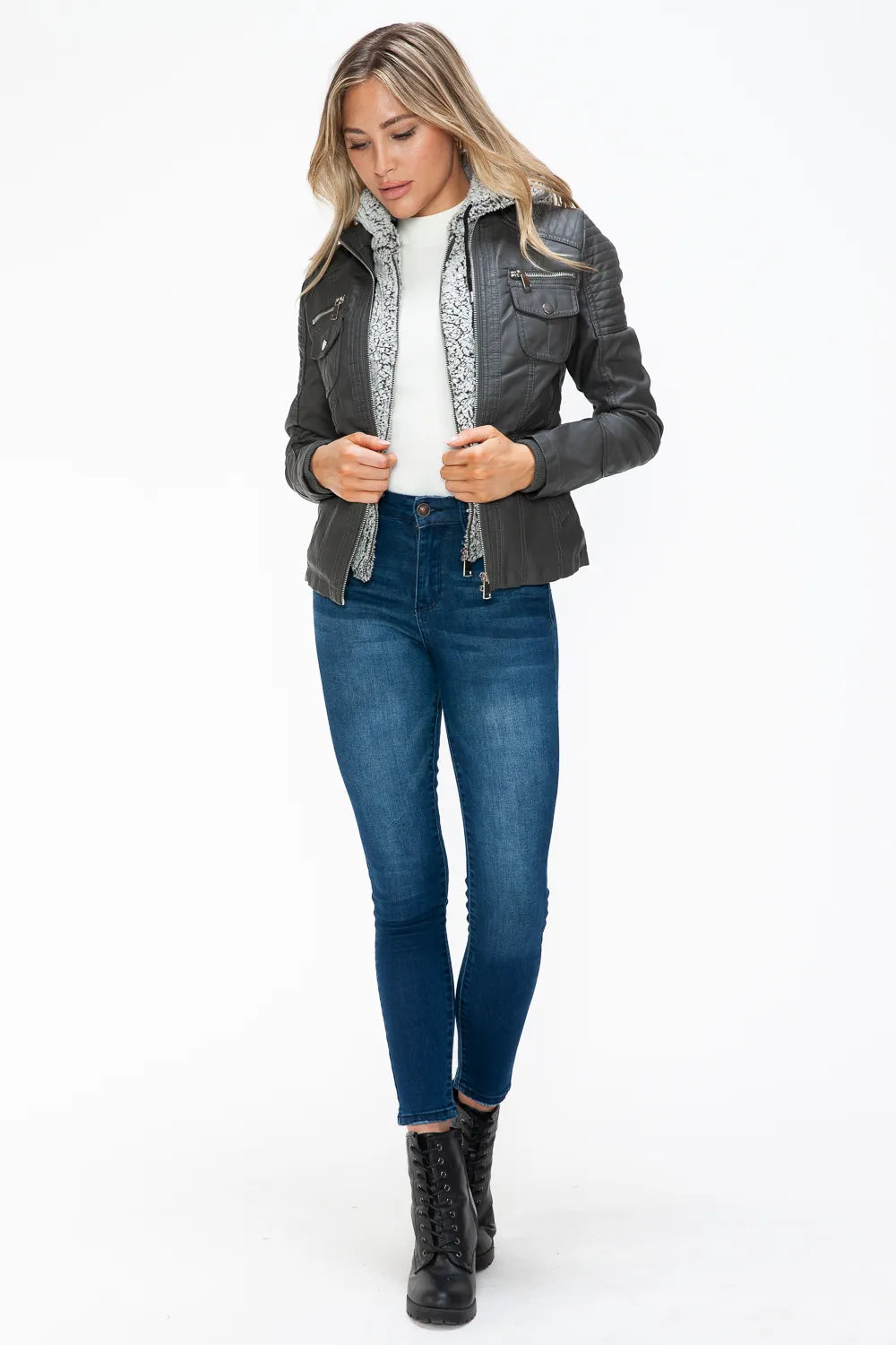 YMI Removable Faux Layered Multi-Pocket Jacket with Fuzzy Hood